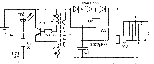 當按下電源開關SA時,由三極管VT1和升壓變壓器T構成的高頻振蕩器通電工作,把3V直流電變成18kHz左右的高頻交流電,經T升壓到約500V,再經三支1N4007二極管、電容器C1~C3組成的三倍壓整流電路升高到1500V左右,加到特制的金屬網上。當蚊蠅觸及金屬網絲時,高壓就會通過蟲體放電,將蚊蟲擊斃。