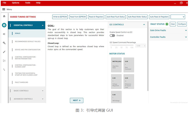 在無傳感器 FOC 算法中,由于集成了先進控制技術,因此可以顯著加快電機調諧,例如,通過自行測量電機參數或自動執行控制環路的調諧等方式加快速度。引導式調諧圖形用戶界面 (GUI) 提供默認的電機啟動選項(如圖 3 所示),有助于順利完成調諧過程并盡快使電機旋轉起來。無需編程的電機驅動器(例如用于 FOC 的 MCF8316A 和用于梯形控制的 MCT8316A)包括用于電機啟動以及閉環和電機停止操作的多個可配置選項。借助這些選項,在幾分鐘內就能優化電機性能,顯著縮短了設計周期。