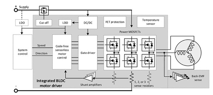 對許多系統設計人員來說,BLDC 系統硬件構建工作都很吃力。一個典型的系統需要柵極驅動器、MOSFET、電流感應放大器、電壓感應比較器和模數轉換器。大多數系統需要專用的電源架構(包括低壓降穩壓器或直流/直流降壓穩壓器等器件)為板上的所有組件供電。集成的 BLDC 驅動器結合了所有這些組件,提供了一個緊湊但易于使用的解決方案,如圖 4 所示。
