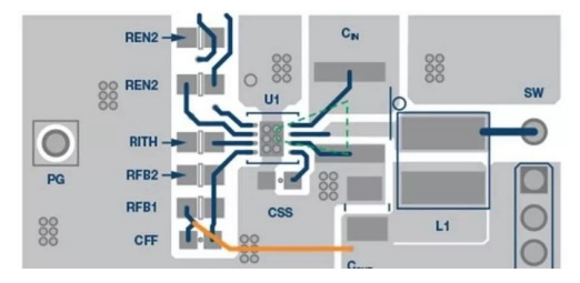不得在電感下方(PCB 表面或下方都不行)、在內(nèi)層里或 PCB 背面布設(shè)敏感的控制走線。受電流流動(dòng)的影響,線圈會(huì)產(chǎn)生磁場(chǎng),結(jié)果會(huì)影響信號(hào)路徑中的微弱信號(hào)。在開關(guān)穩(wěn)壓器中,一個(gè)關(guān)鍵信號(hào)路徑是反饋路徑,其將輸出電壓連接到開關(guān)穩(wěn)壓器 IC 或電阻分壓器。