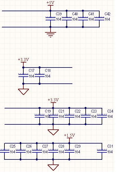 從圖1-1中可知道供電有+5V、+3.3V、+1.5V三種,其中每個電源均有0.1μF的旁路電容,將電源中的高頻串擾旁路到地,防止高頻信號通過電源串擾到其它模塊中。同時還能將電源本身的工頻干擾濾除。
