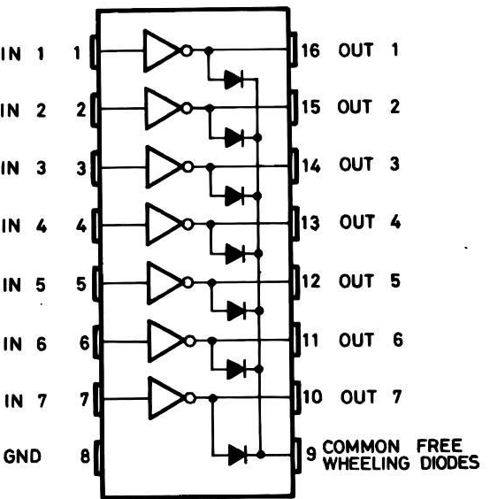 芯片ULN2003內部集成7組達林頓管,專門用于提高驅動電流,芯片引腳間邏輯如圖2-3所示: