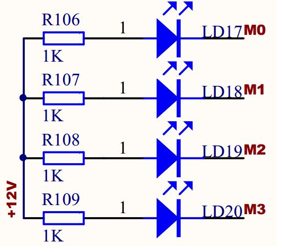 FM0~3來說,輸出高電平就能點亮對應的發光二極管,例如:FM0輸出高電平,則對應LD17點亮,編程時應注意此電路將I/O實際邏輯反相了兩次,對應關系為I/O口輸出哪路高電平則對應點亮哪路指示燈。