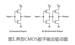 在采樣速率低于200 MSPS的ADC中,CMOS是很常見的數字輸出。典型的CMOS驅動器由兩個晶體管(一個NMOS和一個PMOS)組成,連接在電源(VDD)和地之間,如圖1a所示。這種結構會導致輸出反轉,因此,可以采用圖1b所示的背對背結構作為替代方法,避免輸出反轉。輸出為低阻抗時,CMOS輸出驅動器的輸入為高阻抗。在驅動器的輸入端,由于柵極與導電材料之間經柵極氧化層隔離,兩個CMOS晶體管的柵極阻抗極高。輸入端阻抗范圍可達k?至M?級。在驅動器輸出端,阻抗由漏電流ID控制,該電流通常較小。此時,阻抗通常小于幾百?。CMOS的電平擺幅大約在VDD和地之間,因此可能會很大,具體取決于VDD幅度。