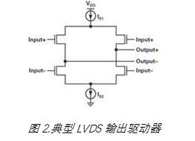 與CMOS技術相比,LVDS具備一些明顯優勢。它可以在低電壓信號(約350 mV)下工作,并且為差分而非單端。低壓擺幅具有較快的切換時間,可以減少EMI問題。差分這一特性可以帶來共模抑制的好處。這意味著耦合到信號的噪聲對兩個信號路徑均為共模,大部分都可被差分接收器消除。LVDS中的阻抗必須更加嚴格控制。在LVDS中,負載阻抗應約為100 ?,通常通過LVDS接收器上的并聯端接電阻實現。此外,LVDS信號還應采用受控阻抗傳輸線進行傳輸。差分阻抗保持在100 ?時,所需的單端阻抗為50 ?。圖2所示為典型LVDS輸出驅動器。