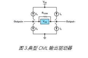 CML驅動器用于串行數據接口,因此,所需引腳數要少得多。圖3所示為用于具有JESD204接口或類似數據輸出的轉換器的典型CML驅動器。該圖顯示了CML驅動器典型架構的一般情況。其顯示可選源終端電阻和共模電壓。電路的輸入可將開關驅動至電流源,電流源則將適當的邏輯值驅動至兩個輸出端。