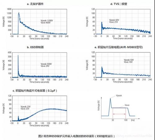 圖 e,壓敏電阻和 TVS 二極管差不多,Vpeak 和 Vave 都比較低,靜電吸收能力強,因為壓敏電阻內部帶有電容量成分,在 Vpeak 抑制上比 TVS 更有力。