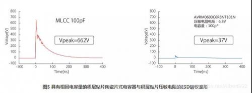 下圖,帶有 100pF 電容量的壓敏電阻和 100pF 的 MLCC,壓敏電阻的 ESD 性能比 MLCC 好得多,壓敏電阻除了電容的作用外,還有本身壓敏電阻的作用。