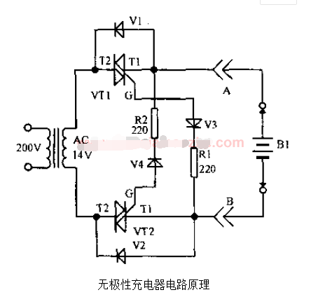 未接蓄電池時(shí),晶閘管VT1、VT2無(wú)柵電流,電路處于截止?fàn)顟B(tài)。當(dāng)A端接蓄電池正極、B端接負(fù)極時(shí),由蓄電池為VT1提供柵流使VT1導(dǎo)通,交流電正半周經(jīng)晶閘管VT1和二極管V2對(duì)蓄電池進(jìn)行充電。同理,若B端接蓄電池正極、A端接負(fù)極時(shí),則VT2因蓄電池提供柵流而導(dǎo)通,交流電負(fù)半周經(jīng)VT2、V1給蓄電池充電。