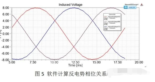 下圖中仿真的了電機逆時針旋轉時,ABC繞組空間按逆時針排布,仿真結果中反電勢關系為A-C-B超前120°。