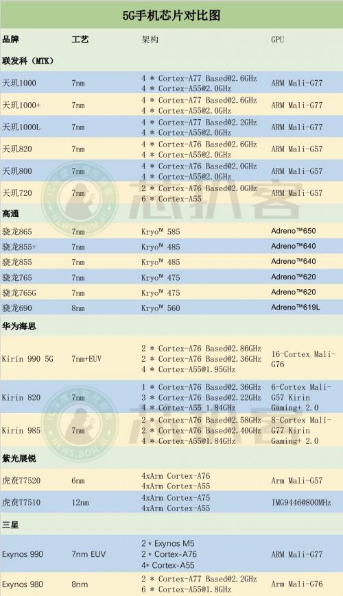一圖了解5G手機芯片(截至2020年7月)