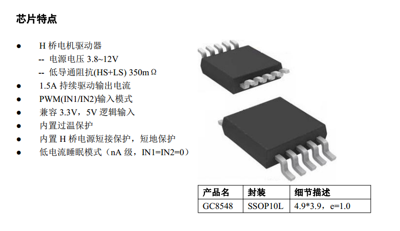 GC8548 是一款雙通道 12V 直流電機驅動芯片,為攝像機、消費類產品、玩具和其他低壓或者電池供電的運動控制類應用提供了集成的電機驅動解決方案。芯片一般用來驅動兩個直流電機或者驅動一個步進電機。GC8548 可以工作在 3.8~12V 的電源電壓上,每通道能提供高達 1.5A 持續輸出電流或者 2.5A 峰值電流,睡眠模式下功耗小于1uA。GC8548 具有 PWM(IN/IN)輸入接口,與行業標準器件兼容,并具有過溫保護,欠壓保護,短路保護,過流保護等功能。GC8548 內置 LDO,不需要邏輯電源,輸入兼容 3.3V 與 5V。