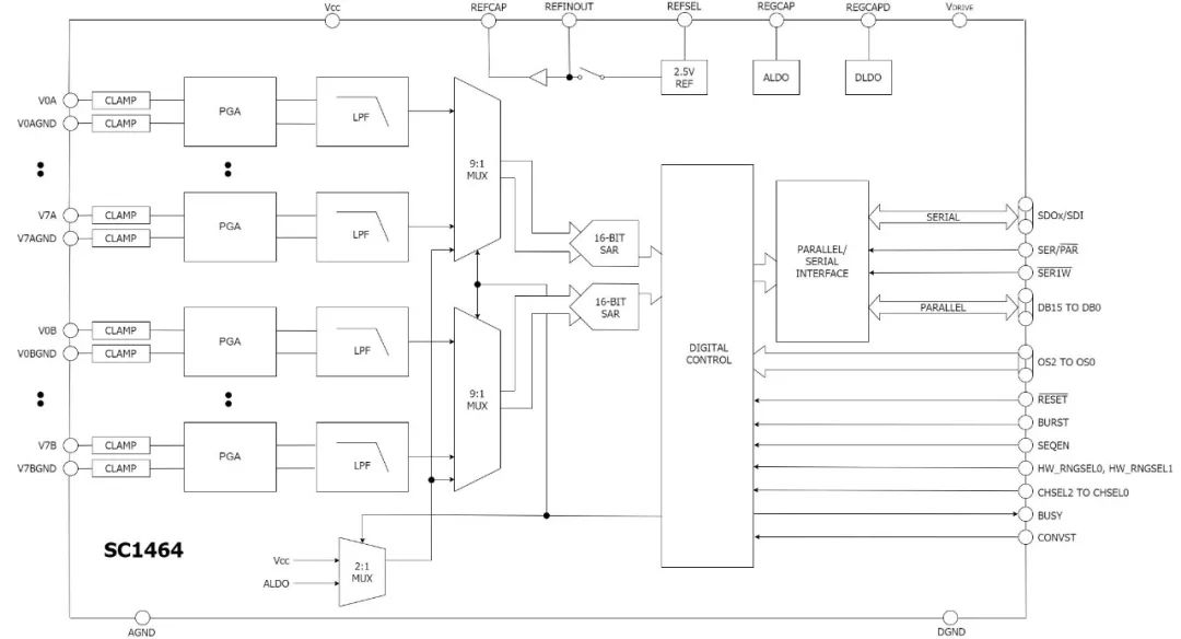 SC1464是一款16位數據采集系統,內置雙路16位SAR模數轉換器 (ADC),支持對16個通道進行雙路同步采樣,每個通道均集成模擬輸入箝位保護和模擬濾波器。該器件還集成了靈活的數字濾波器、2.5 V精密基準電壓源和基準電壓緩沖器以及串行和并行接口。
