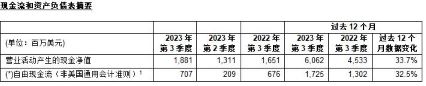 2023年第三季度,營業活動產生的凈現金流為18.8億美元,去年同期16.5億美元。