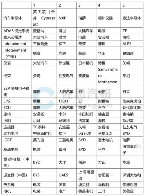 本文提供了 20 個汽車電子細分市場的前五名企業,可能有偏差,僅供參考。