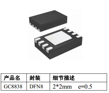 GC8838 可以工作在 0~12V 的電源電壓上, 能提供高達 1.5A 持續輸出電流或者 2.5A峰值電流, 睡眠模式下功耗小于 1uA。