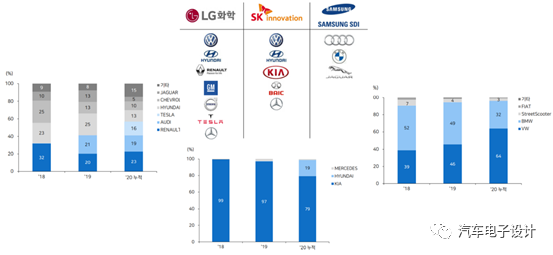 三家韓國公司的增長歸因于,歐洲和美國車企的安裝量的迅速上升: LG Chem:Renault ZOE,特斯拉 Model 3(中國制造)和奧迪 E- Tron EV 銷量需求 三星 SDI:增長歸功于大眾 e-Golf ,寶馬 330e 和帕薩特 GTE 的強(qiáng)勁銷售 SK Innovation 在現(xiàn)代起亞的銷量需求提升和戴姆勒的 PHEV 銷量需求上升 如下圖所示,這些是海外的基本盤。