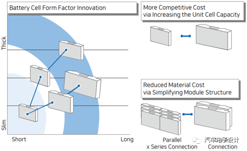 在這種模式下,模組還是模組,還是可修的,但是整個裝配過程變?yōu)橛邢迋€模組,而且之間的隔離度也比較好。在電芯的演變上,SDI 給的這個圖還是可以參考的,方殼電芯在結(jié)構(gòu)上的創(chuàng)新還將延續(xù),只不過在具體的操作形式上,中韓兩邊是有點(diǎn)分歧了