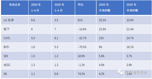 表 1 2020 年 1-4 月份的市場份額 電池企業(yè)