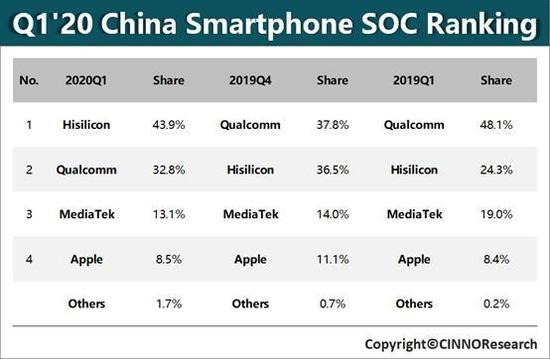 CINNO的數(shù)據(jù)顯示,去年第四季度,高通驍龍芯片市場份額為37.8%,海思麒麟芯片市場份額為36.5%,華為在今年一季度實現(xiàn)了超越。