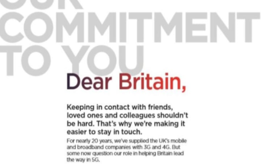 華為在《我們對你們的承諾》廣告中稱:“近20年來,我們為英國的移動和寬帶公司提供了3G、4G網絡,但是一些人現在質疑我們在幫助英國引領5G部署方面所扮演的角色。華為將繼續一如既往地為你們的網絡運營商提供最好的設備,這樣你們就可以分享照片、觀看流媒體電影。”