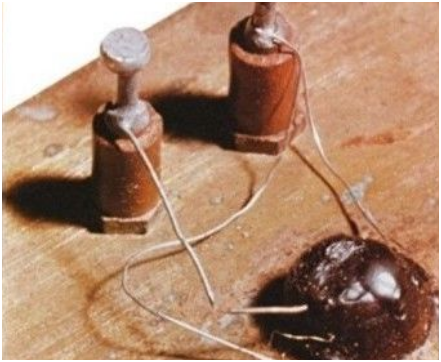 在1947年,貝爾實驗的Walter H. Brattain第一個開發制作了這個裝置。在一個塑料支架上,放置了一個銅塊,上面又安裝了一大塊半導體鍺(Germanium)。