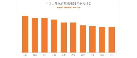 中國大陸城市集成電路競爭力排行榜前 10 強中,長三角地區占有五席,分別是上海、無錫、合肥、南京、蘇州(其中江蘇省有三座城市入選);珠三角地區只有深圳京一個城市入圍;而環渤海也只有北京一個城市入選;中西部有三個城市入選,分別是成都、西安、武漢。