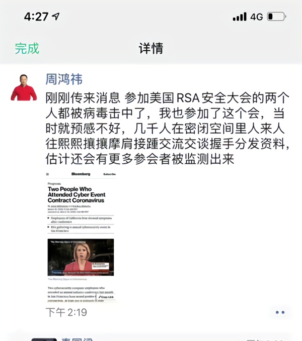3月11日下午,周鴻祎在朋友圈發(fā)文表示,自己也參加了這次大會,當時就預感不好,因為幾千人在密閉空間里人來人往熙熙攘攘摩肩接踵交流交談握手分發(fā)資料,他估計還會有更多參會者被檢測出來。