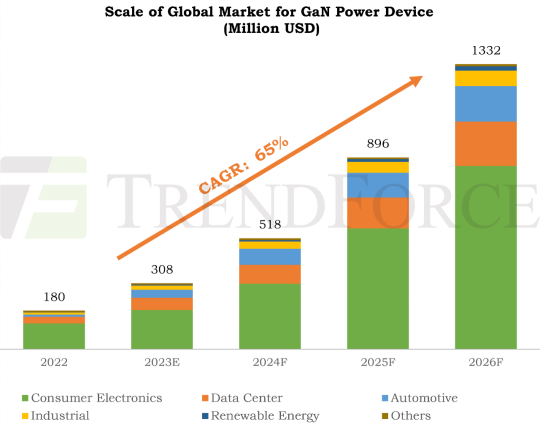 據(jù)市場研究機構(gòu)TrendForce集邦咨詢顯示,到2026年,全球GaN功率元件市場規(guī)模將從2022年的1.8億美金成長到13.3億美金,復合增長率高達65%。