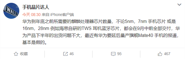 此外,該博主表示,“雖然美國在五月對華為進一步制裁,我擔保10月份華為會如期發(fā)布5nm工藝麒麟處理器的Mate 40手機。第四季可以供貨約8百萬支Mate 40 手機。 ”