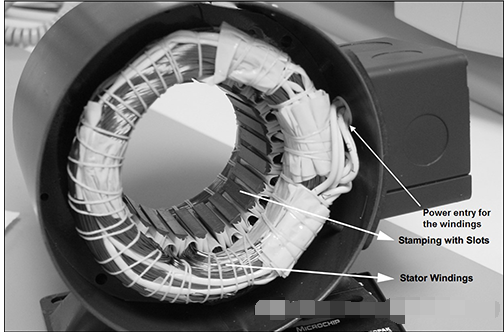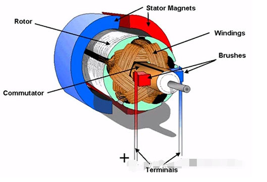 圖2:在有刷電機(jī)里,導(dǎo)電刷(用銅刷毛或更有可能是石墨塊制作而成)接觸轉(zhuǎn)子上的觸點(diǎn)。隨著轉(zhuǎn)子變向,它會切換周圍線圈電流的極性。(圖片來源:Microchip Webinar)