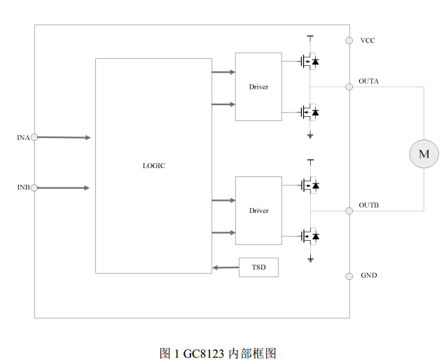 GC8123 是一款低壓 5V 全橋驅動芯片,為攝像機、消費類產品、玩具和其他低壓或者電池供電的運動控制類應用提供了集成的電機驅動解決方案。GC8123 能提供高達 1.2A 的持續輸出電流。可以工作在 1.2~7V 的電源電壓上。GC8123 具有 PW(IN/IN)輸入接口,與行業標準器件兼容, 并具有過溫保護功能。