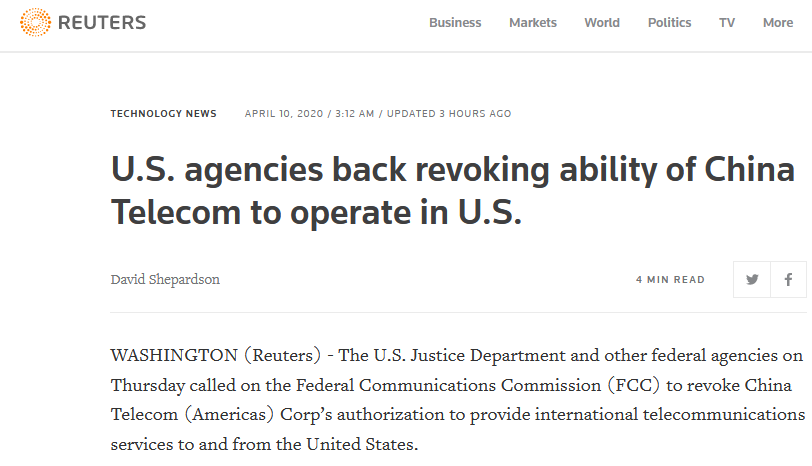 美國民主黨參議院領(lǐng)袖 Charles Schume 與共和黨參議員 Tom Cotton 在信中要求FCC主席 Ajit Pai 檢討,其在2000年代初期允許中國電信與中國聯(lián)通在美國運(yùn)營是否存在“危害國家安全”的隱患。