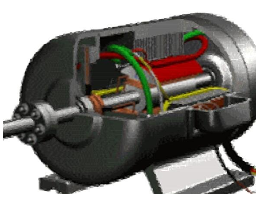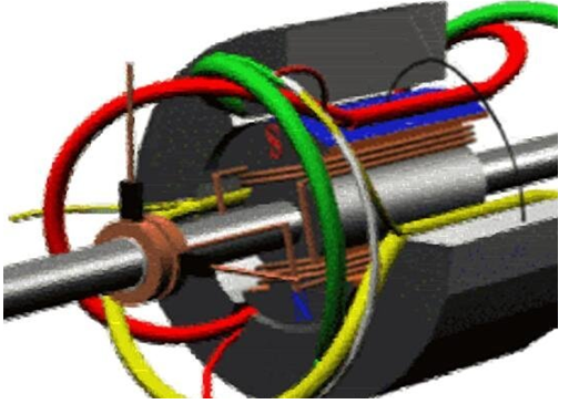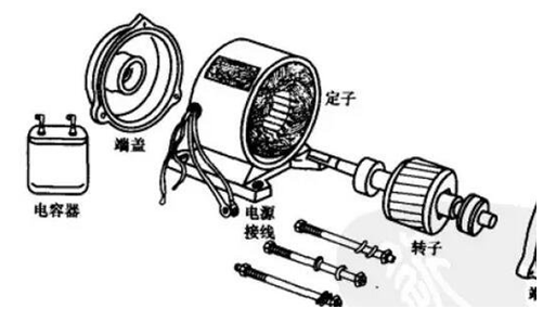電機中主要包含一個用以產生磁場的電磁鐵繞組或分布的定子繞組和一個旋轉電樞或轉子和其它零件組成。在定子繞組旋轉磁場的作用下,其在電樞鼠籠式鋁框中有電流通過并受磁場的作用而使其轉動。