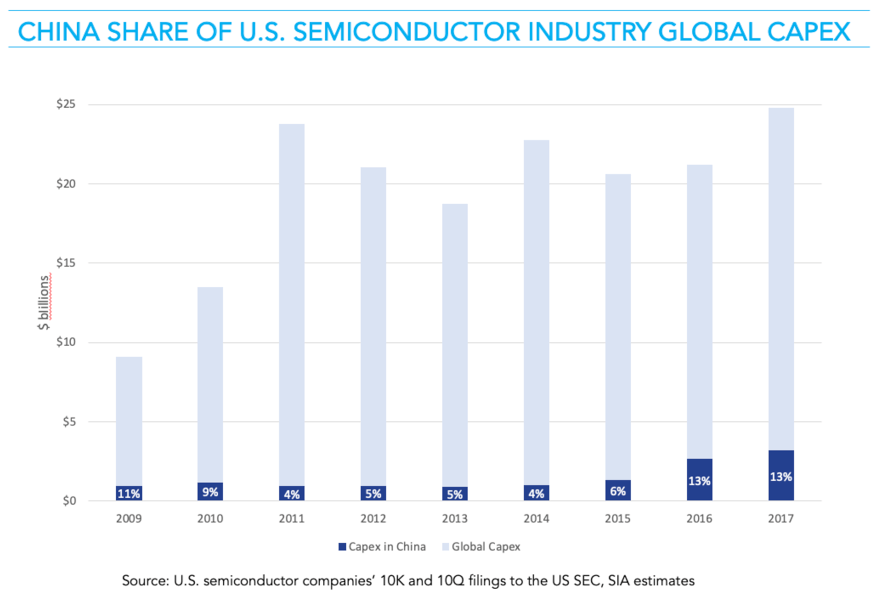 一些報告和政策制定者最近宣稱,美國半導(dǎo)體公司正在將芯片生產(chǎn)大量外包給中國。雖然目前美國半導(dǎo)體制造業(yè)的份額僅占全球產(chǎn)能的12%,而且美國公司設(shè)計的芯片在海外生產(chǎn)的數(shù)量比美國本土的還要多,但事實上,大多數(shù)美國芯片并非在中國生產(chǎn)。例如,美中經(jīng)濟(jì)與安全審查委員會(USCC)最近的一份報告指出,美國跨國企業(yè)(MNE)在華半導(dǎo)體制造資產(chǎn)的資本支出從2010年的12億美元躍升至2017年的32億美元,提高了166.7%。然而,該報告并沒有從歷史上的全球資本支出支出的角度來看待這些投資。雖然從表面上看,這聽起來像是一大筆錢,而且增長率非常高,但與美國行業(yè)歷史上的年度資本支出相比,這個數(shù)字相對還很小。