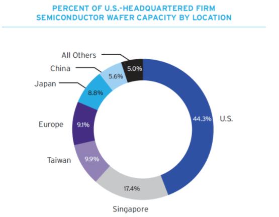 仔細(xì)研究,現(xiàn)實情況是,美國公司在中國建立的半導(dǎo)體前端產(chǎn)能僅占美國公司全部產(chǎn)能的5.6%,美國半導(dǎo)體制造商44%的生產(chǎn)能力仍在美國,遍布18個州70家工廠。但正如圖表所示,許多美國公司選擇了將業(yè)務(wù)擴(kuò)展到海外,因為那里有更具吸引力的政策。