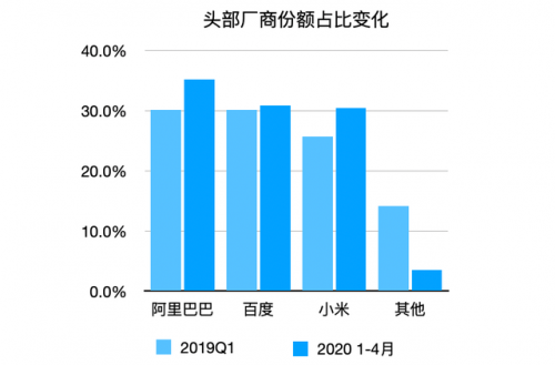 雖然智能音箱的整體銷量受到新冠疫情的一定影響,但從市場份額上看,3 大頭部廠商的市占率相較 2019 年都保持了上漲的趨勢,阿里、百度、小米三大巨頭的總份額已高達 95%以上。其中,阿里巴巴排名第一,總銷量為 371 萬,市場份額為 35.2%;百度占比 30.9%,排名第二;小米占比 30.4%,名列第三。