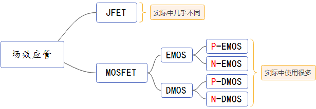 場效應管分為結型(JFET)和金屬 - 氧化物 - 半導體型(MOSFET)兩種類型,MOSFET 應用廣泛,結型管(JFET)幾乎不用,MOSFET 一般稱 MOS 管。
