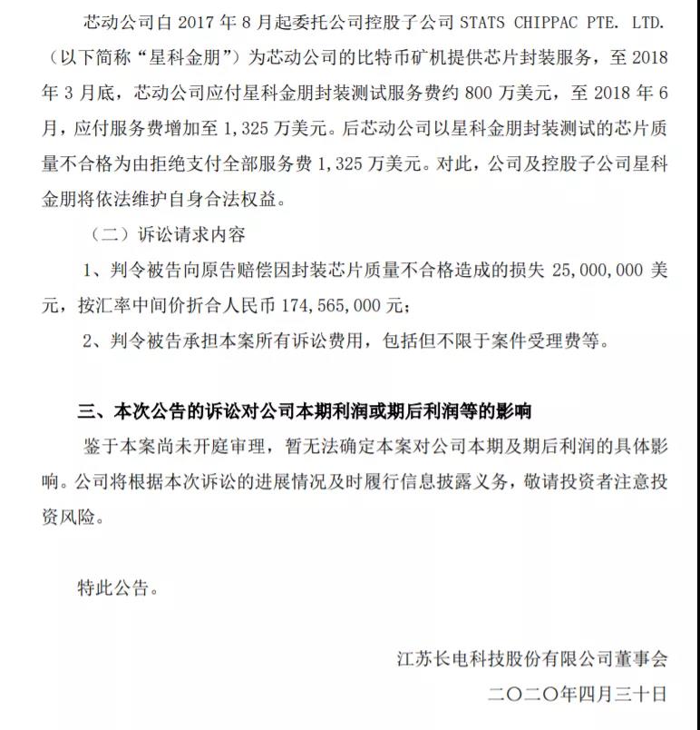 突發!質量問題!長電科技遭索賠1.7億!