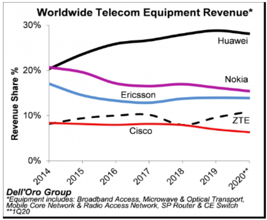 [導讀]Dell'Oro發布了2020年一季度全球電信設備市場報告。報告給出了電信設備供應商的市場收入情況