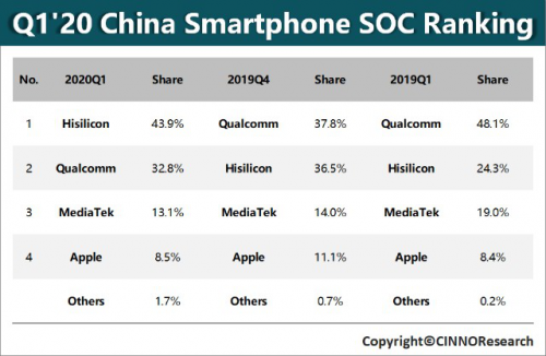 根據市場調研機構 Canalys 公布的數據,2020 年第一季度全球智能手機出貨量同比下滑 13%,另一家調研機構 CINNOResearch 的數據顯示,華為海思芯片 2020 年第一季度中國市場出貨量首次超過高通,位居榜首。