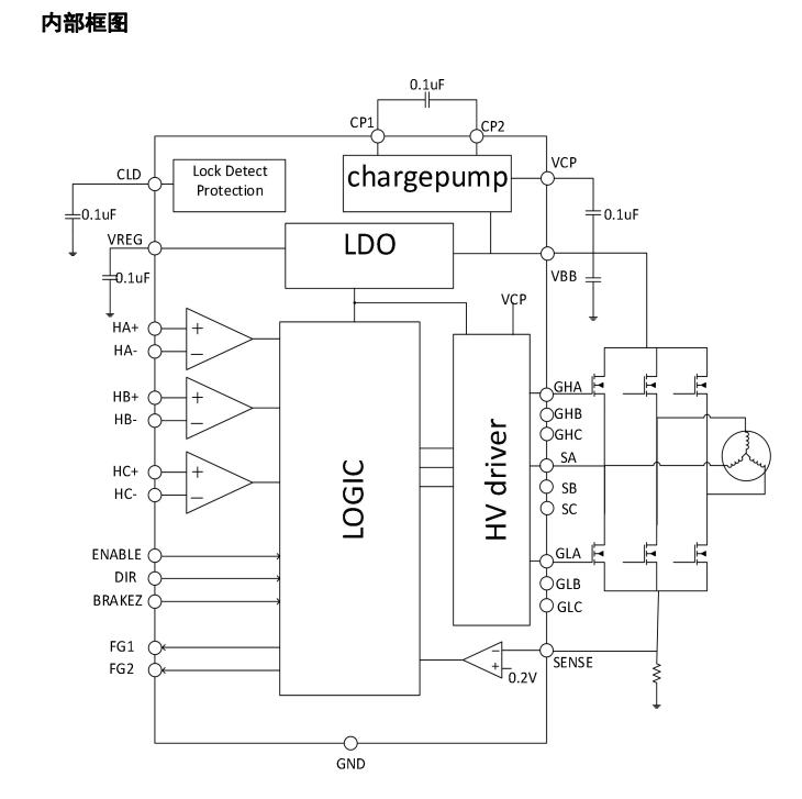 GC4931F/S 的邏輯輸入腳有使能控制(ENABLE),方向控制(DIR),剎車控制(BRAKE);邏輯輸出腳有 FG1,FG2 與霍爾信號對應,可以用來監測轉動速度。