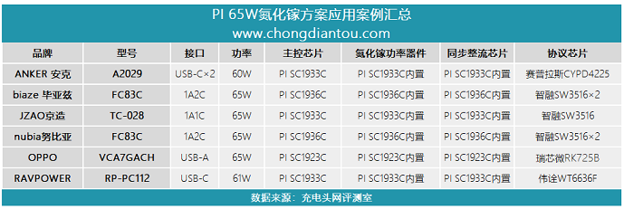 充電頭網通過對比以往拆解的16款市售熱門65W氮化鎵快充充電器案例(安克、倍思、小米、魅族、努比亞、京造、OPPO、RAVPOWER等品牌都在其中),發現以上產品的氮化鎵功率芯片供應商主要有PI、納微、英諾賽科三家。