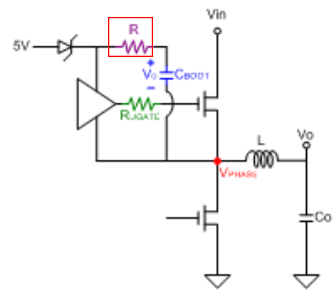 其實在自舉電路中,也可以加入電阻,一般叫 BOOT 電阻。BOOT 電容的作用是 SW 在高電平時,利用電容兩端電壓不能突變特性,會將 BOOT 腳電壓泵至比 SW 高的電壓,維持高邊 MOSFET 的導通狀態。