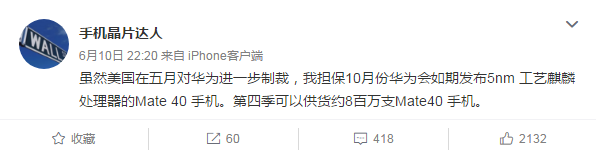 6月11日消息,微博大V@手機(jī)晶片達(dá)人爆料:今年10月份華為會(huì)如期發(fā)布5nm工藝麒麟處理器的Mate 40系列手機(jī),并將在第四季供貨約8百萬臺(tái)Mate 40手機(jī)。