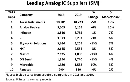 日前,國際知名分析機構ICinsights發布了最新的全球十大模擬廠商排行榜。據其榜單,美國芯片廠商德州儀器(TI)以102億美元的模擬芯片銷售額和19%的市場份額,繼續坐穩2019年模擬芯片供應商龍頭的位置。